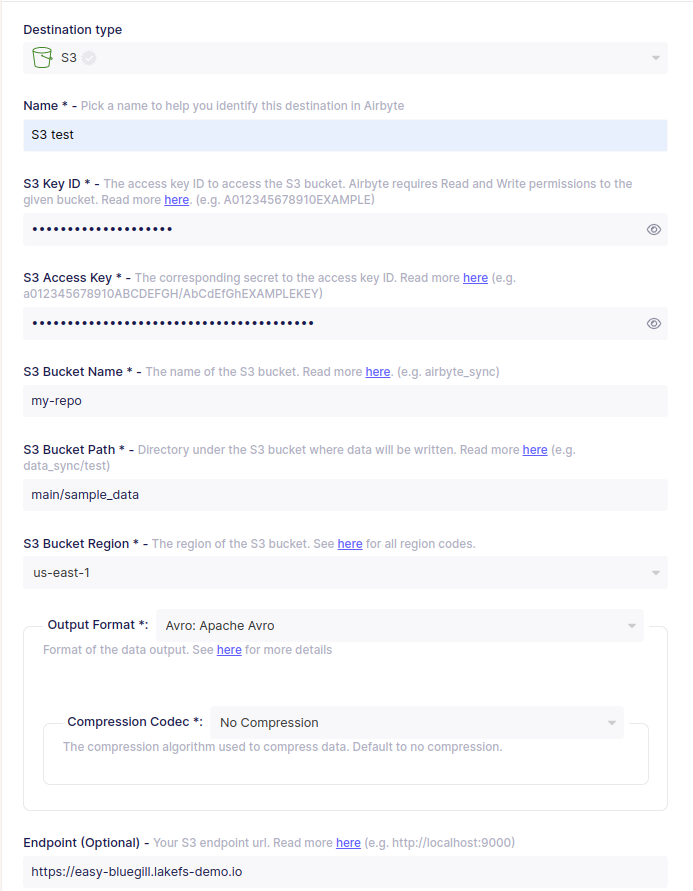 | S3 Bucket Region | Not applicable to lakeFS, use us-east-1 |